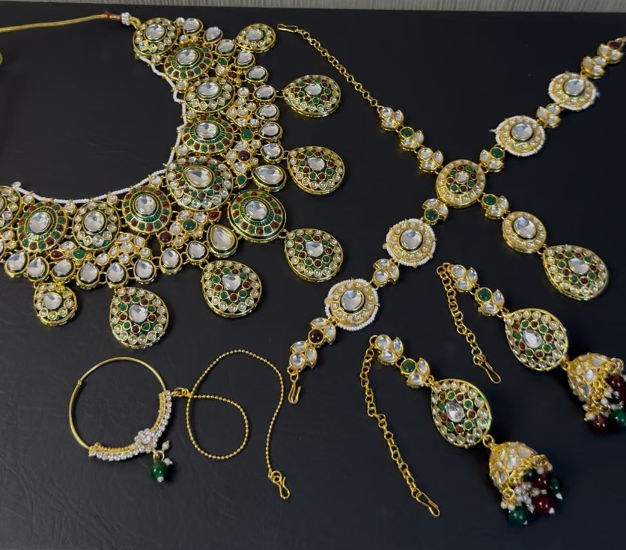 Indian Polki KUNDAN and MEENAKARI Work Set with Matha patti , JHUMKI Earrings and Nose ring